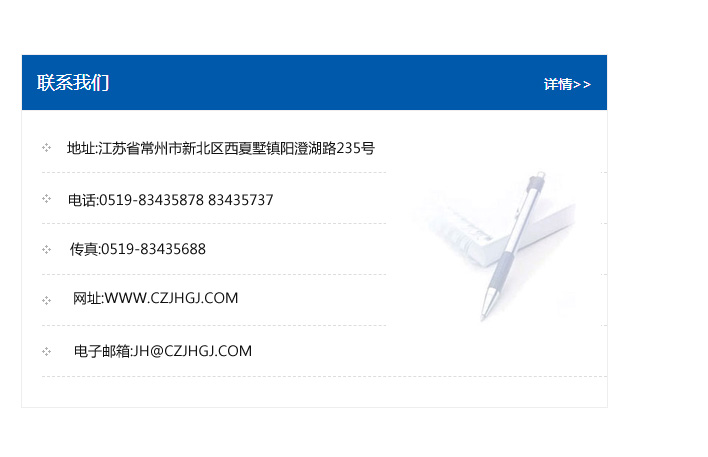 地址:常州市新北區友邦商務大廈1幢16、17層  電話:0519-85101652  傳真:0519-85112595  郵編:213022  網址:www_cz-jiayue_cn.yizemedia.com  郵箱:xiajifengaa@163.com